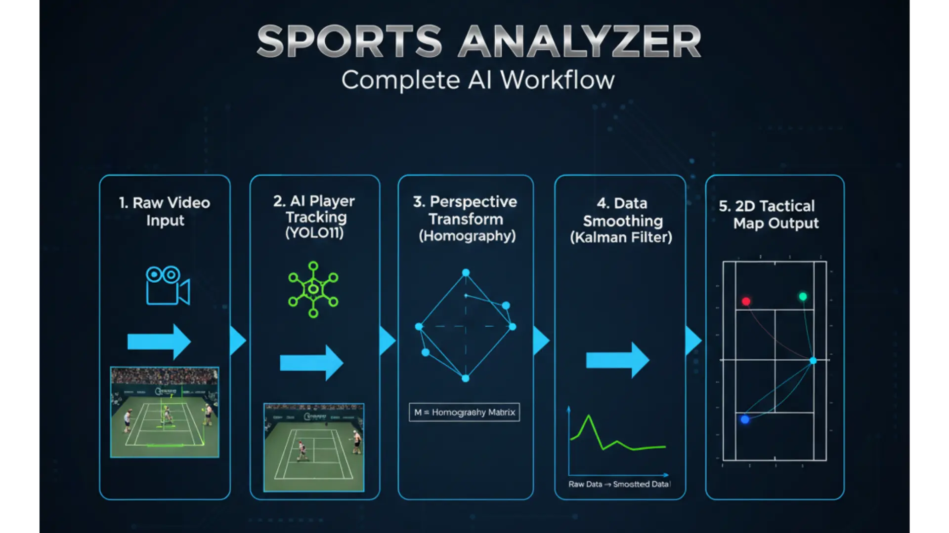 Each stage is critical. A mistake in tracking leads to incorrect mapping on the 2D court.