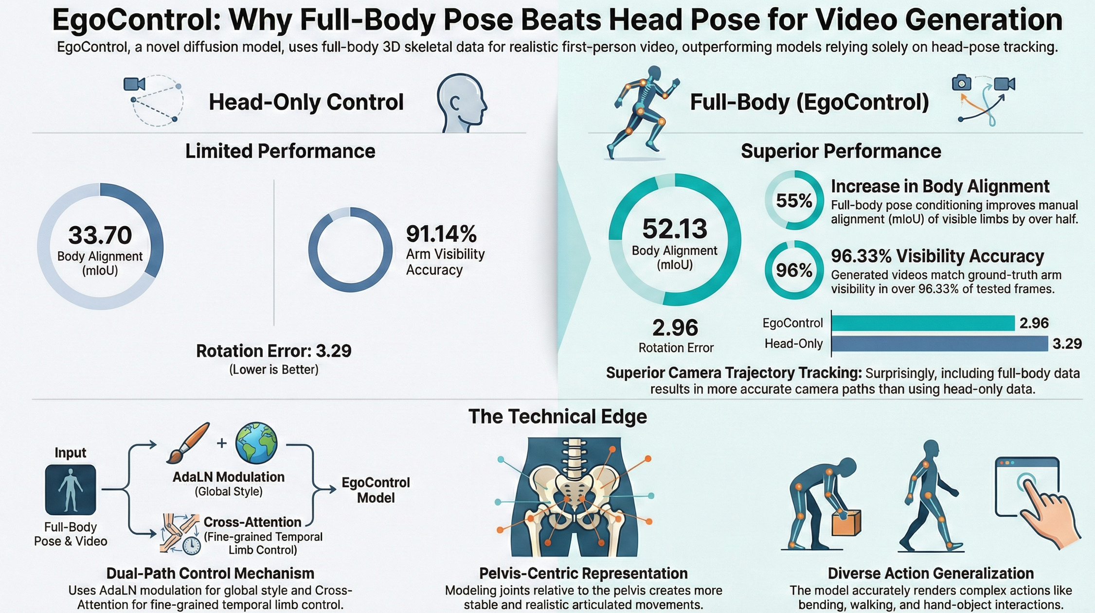 More importantly, it establishes a key insight: egocentric vision is not governed by the camera alone. The body is the control signal, and recognizing this changes how controllable video generation should be built going forward.