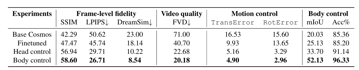 The paper quantifies this gap using explicit body-control metrics. When comparing head-only conditioning to full-body conditioning, EgoControl reports:
