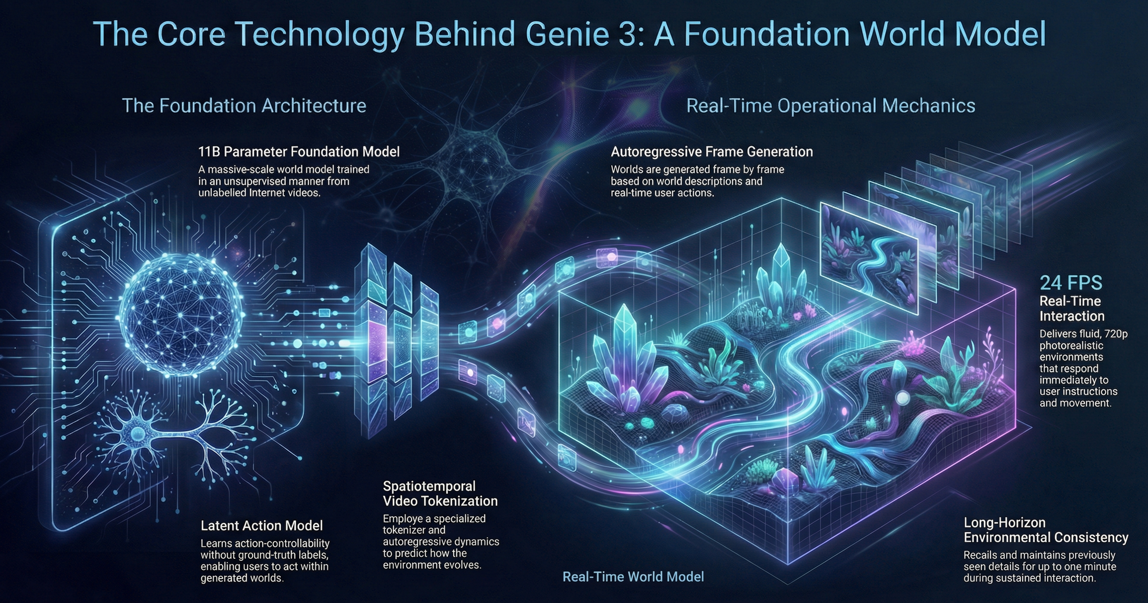 At its core, Genie 3 uses an auto-regressive architecture. Rather than rendering an entire world at once, it predicts the next frame based on: