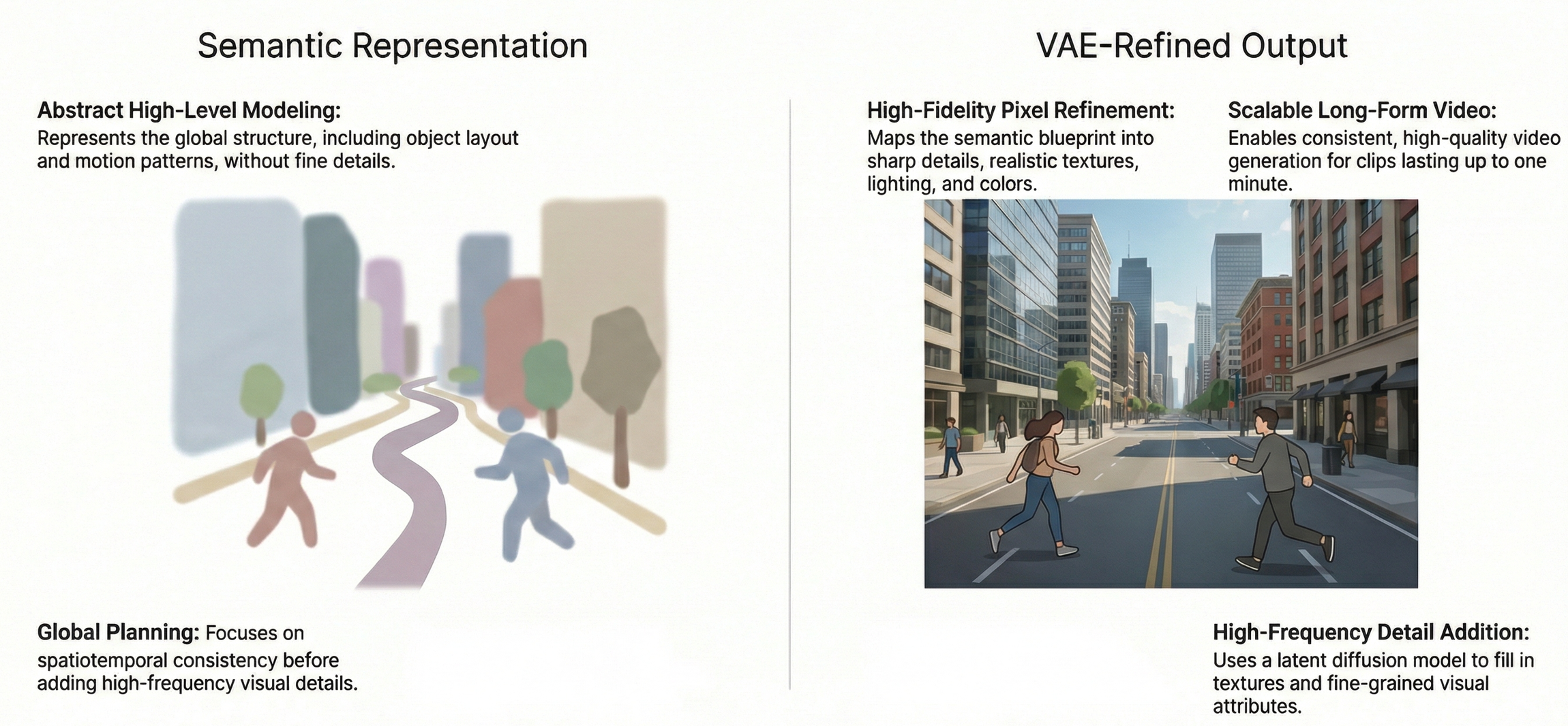 Because the "what" (the semantic blueprint) has already been decided, the VAE generator can focus entirely on the "how" rendering fine-grained textures, lighting effects, and fluid motion.