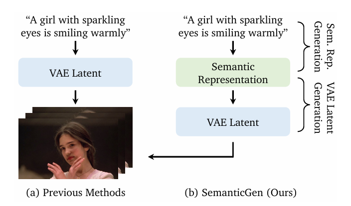 Instead of using standard diffusion processes, which often follow curved and inefficient trajectories, SemanticGen adopts a Rectified Flow formulation that enforces a straight path from noise to data.