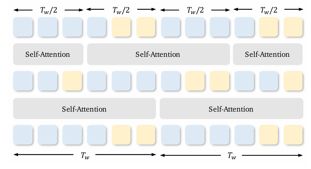To ensure information flows between windows, it shifts them by Tw/2 at odd layers. This creates connections without checking every token against every other token.