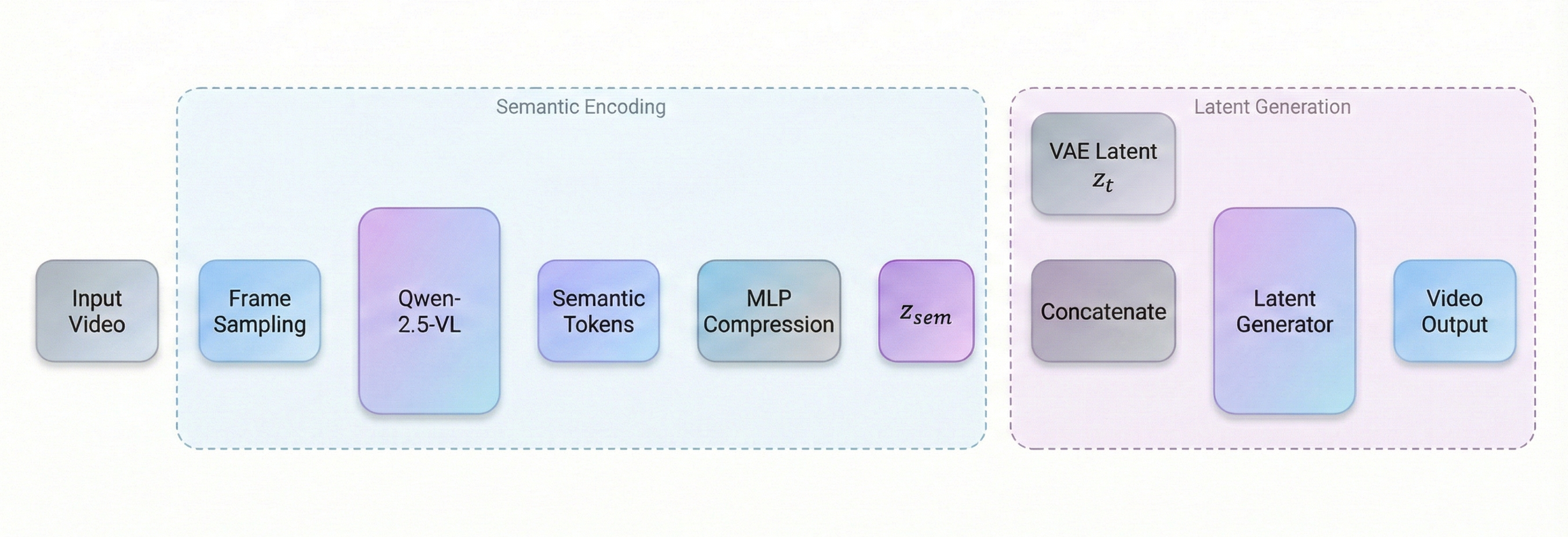 Once compressed, these embeddings (zsem) become the blueprint for the video. They are injected directly into the latent generator.